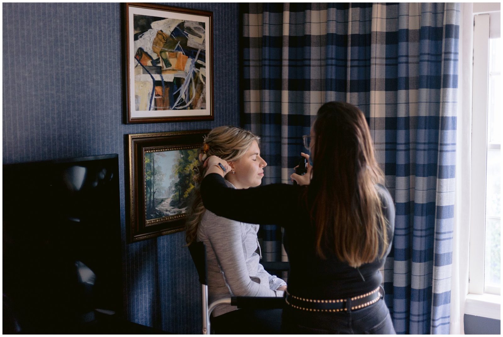Danielle and Pat decided to get ready at a staple State College hotel, the Graduate. This hotel is seriously so cool and makes for the perfect spot for every State College wedding. We love the Penn State and football themed rooms. This hotel had beautiful natural light in the lobby areas and the light in the rooms gave the perfect amount of dramatic lighting for getting ready. The girls had their hair and makeup done there and then got ready on site at Gillbrook Farms. The guys got dressed and hung out with plenty of refreshments 😉 to keep them going throughout the morning.